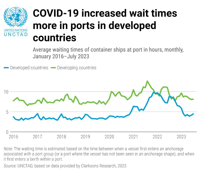 Continuing the theme of just transition in the shipping sector, the report notes the disparity in waiting times at ports in developed countries as a result of quicker clearance times and better infrastructure, with port performance primarily based on levels of automation.