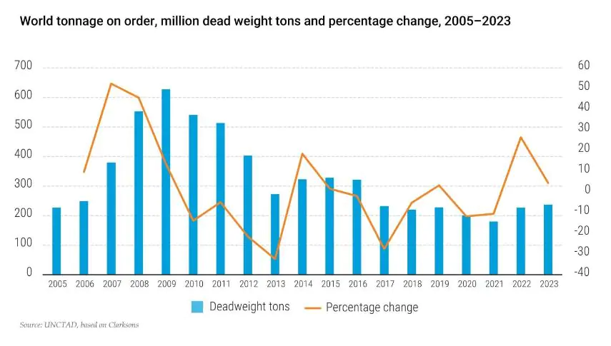 However, relative to the existing fleet, the order book for new ships is small. This is because ship owners, shipyards, and financial institutions are holding out for more clarity regarding matters such as carbon pricing, as well as associated regulatory frameworks.