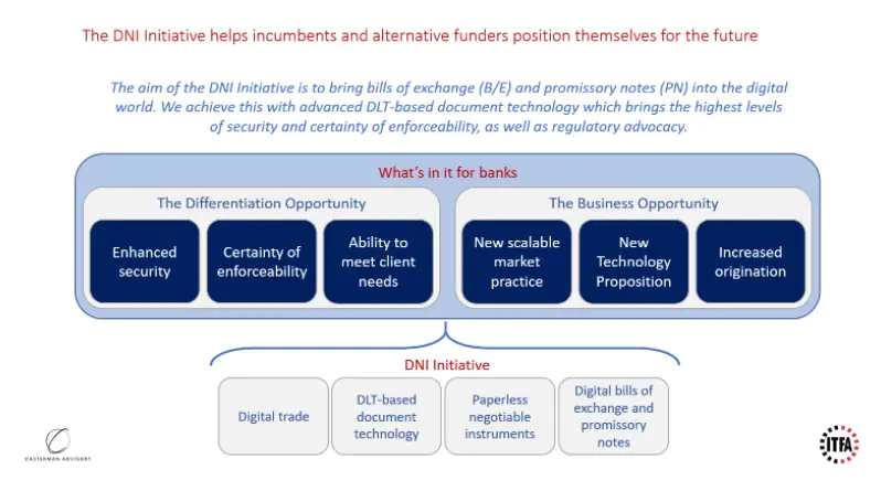 We believe the benefits for banks as well as alternative lenders and export funding platforms are numerous. The DNI Initiative helps them provide additional value thanks to a superior client experience while, at the same time, enhancing the security of the document and certainty around the enforceability of the instrument. The DNI Initiative aims to help banks increase origination volumes thanks to faster processing of client financing requests.