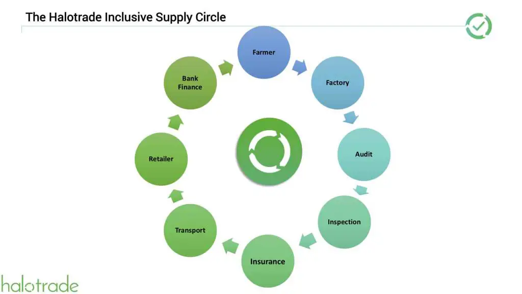 Halotrade uses the combined power of blockchain technology and invoice financing to transform supply chain practices. Our shared ledger technology links the supply chain from end to end: from certifications of farms and factories to tracking shipments around the world until delivery. We help participating suppliers in developing markets access financing terms from global banks. Halotrade creates a sound financial incentive for every player to abide by industry standards set by organizations.