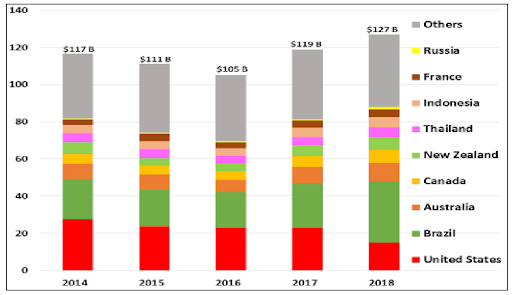 China’s Imports of Agricultural Products, 2014-2018, in Nominal Billions (B) of US Dollars. Source: Congressional Research Service